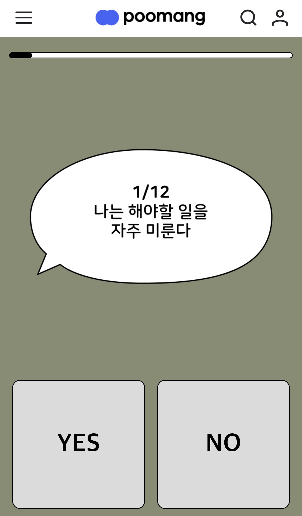 접속하셨다면 이름을 입력하시고 12가지 질문에 "YES" or "NO" 클릭하시면 됩니다.