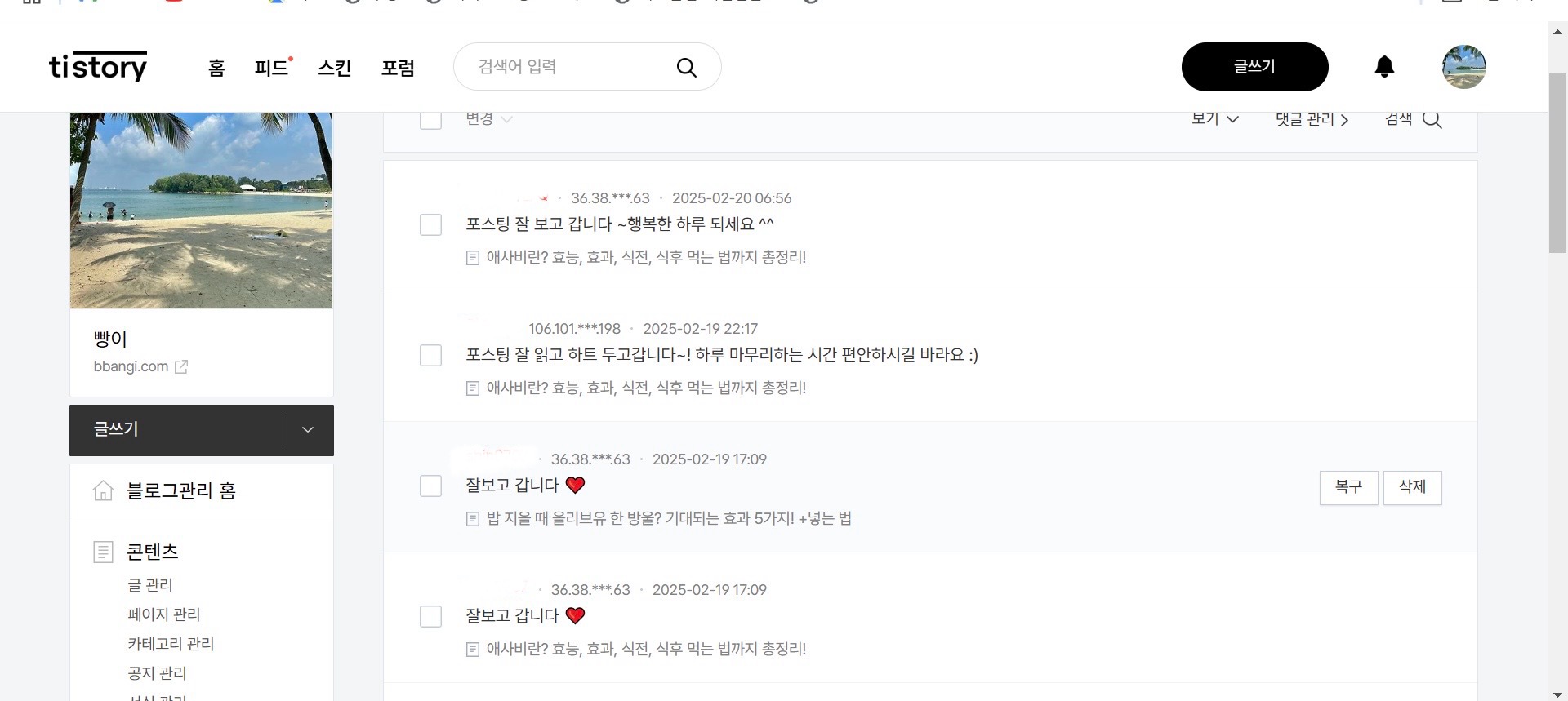 - 자동 삭제 주의: 티스토리에서는 휴지통으로 이동된 댓글이 15일이 지나면 자동 삭제됩니다. 따라서 중요한 댓글이 있다면 해당 기간 안에 복구해야 합니다.